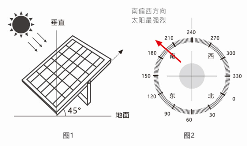 答:太阳能板应放在上方无遮挡物可接收到太阳光线的地方,太阳能板最佳朝向为板与地面保持45°角(如图1,图2) 分体式路灯安装时不可将太阳能板安装在灯具下方,不可安装在灯具能照射的地方,否则影响晚上灯具的使用。因为固禄德的产品本身带有光感功能,有光线照射到太阳能板上,灯具会自动熄灭。